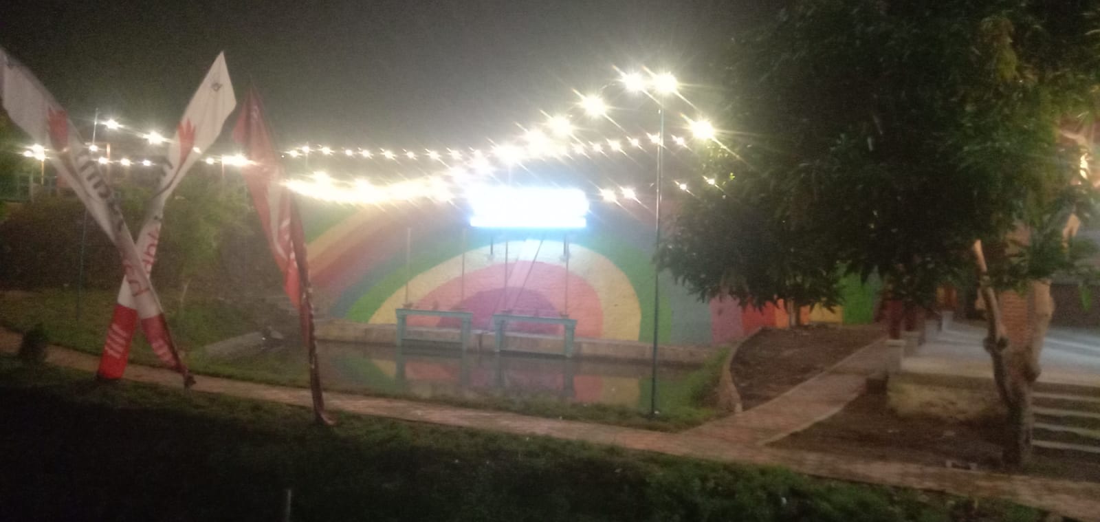 Nampak jembatan kecil yang membentang juga didekorasi dengan lampu hias, hasilnya sungguh indah. Dekorasi aneka warna lampu bercahaya juga menjadi spot selfie yang tidak boleh terlewatkan.