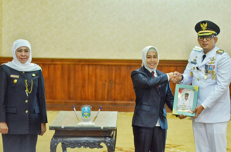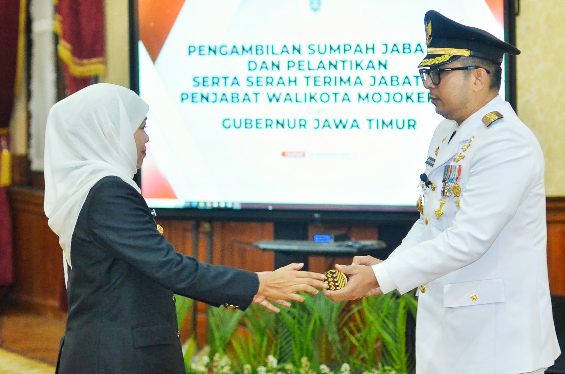 SURABAYAPAGI.com, Mojokerto - Lantik PJ Walikota, Gubernur Jatim Khofifah Indar Parawansa saat melantik Mohammad Ali Kuncoro sebagai Penjabat (Pj) Wali Kota Mojokerto menggantikan Ika Puspitasari yang habis masa jabatannya di akhir tahun 2023, di gedung Negara Grahadi, Minggu (10/12/2023). Pada acara pelantikan ini juga disaksikan oleh Sekdaprov Jatim juga dihadiri OPD dan Forkopimda Kota Mojokerto. SP/Arlana