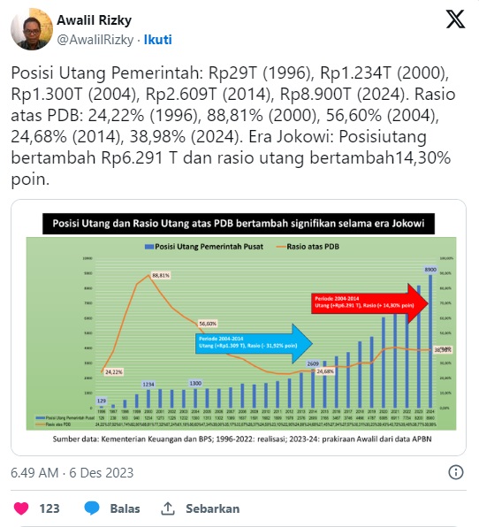 Melalui unggahan kanal twitter tersebut diketahui, Posisi Utang Pemerintah: Rp29T (1996), Rp1.234T (2000), Rp1.300T (2004), Rp2.609T (2014), Rp8.900T (2024). Rasio atas PDB: 24,22% (1996), 88,81% (2000), 56,60% (2004), 24,68% (2014), 38,98% (2024). Era Jokowi: Posisi Utang bertambah Rp6.291 T dan rasio utang bertambah 14,30% poin.