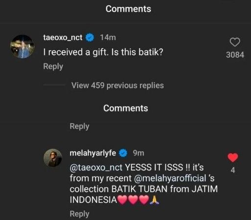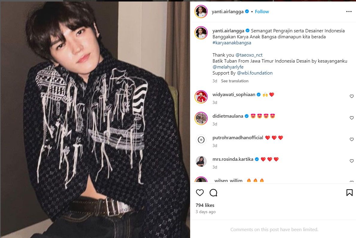 Sementara itu, Yanti juga turut membagikan ulang foto idol K-pop itu memakai busana pemberiannya. Tidak lupa, Yanti juga mengucapkan terima kasih pada Taeyong dan menandai sang desainer.