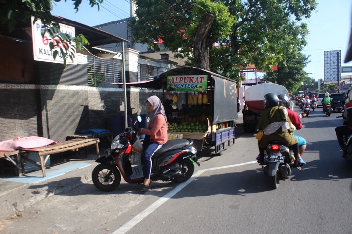 Karena, para pedagang kaki lima yang menjajakan makanan dan minuman, maupun buah dengan menggunakan gerobak hingga mobil pikap berjejer di bahu jalan. Tak jarang juga mereka menggunakan trotoar untuk menjajakan dagangannya.