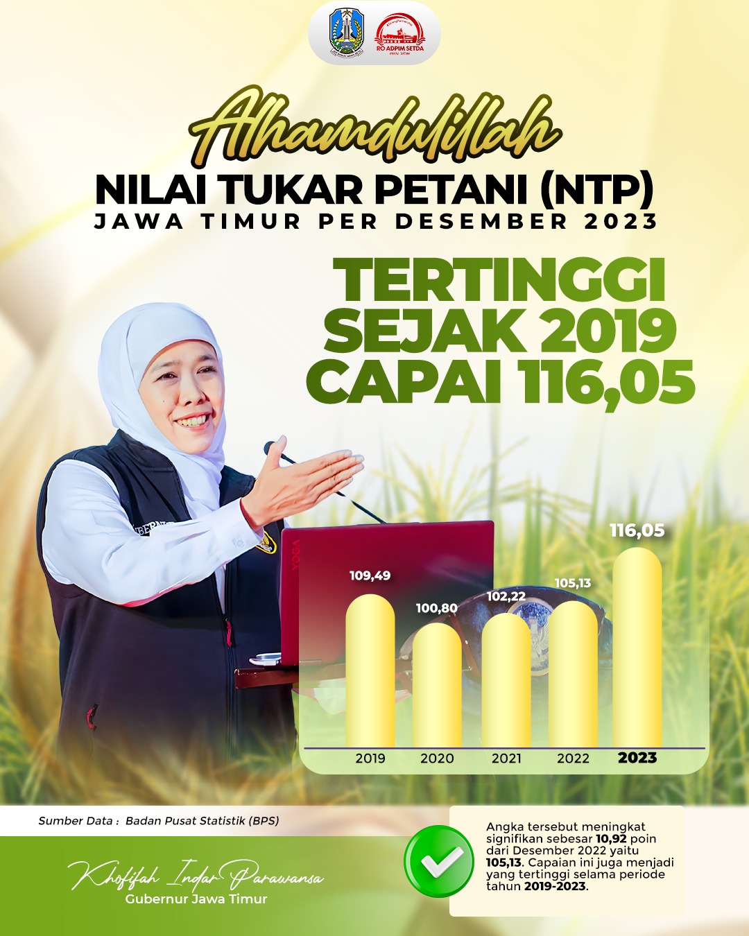 "Alhamdulillah NTP Jatim per Desember 2023, naik signifikan mencapai 116,05. Angka ini menjadi yang tertinggi sejak 2019. Ini jadi bukti bahwa status Jatim sebagai Lumbung Pangan Nasional ber seiring dengan naiknya tingkat kesejahteraan petani di Jawa Timur," ujar Gubernur Khofifah, Rabu (3/1/2024).