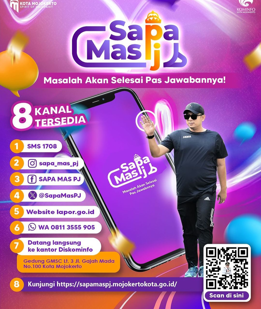 8 kanal tersedia untuk menerima berbagai pengaduan masyarakat, diantaranya SMS di nomor 1708, Instagram sapa_mas_pj, Facebook SAPA MAS PJ, Twitter @SapaMasPJ, Website lapor.go.id, WA 08113555905 dan datang langsung ke kantor Diskominfo di Gedung GMSC Gajah Mada Kota Mojokerto.