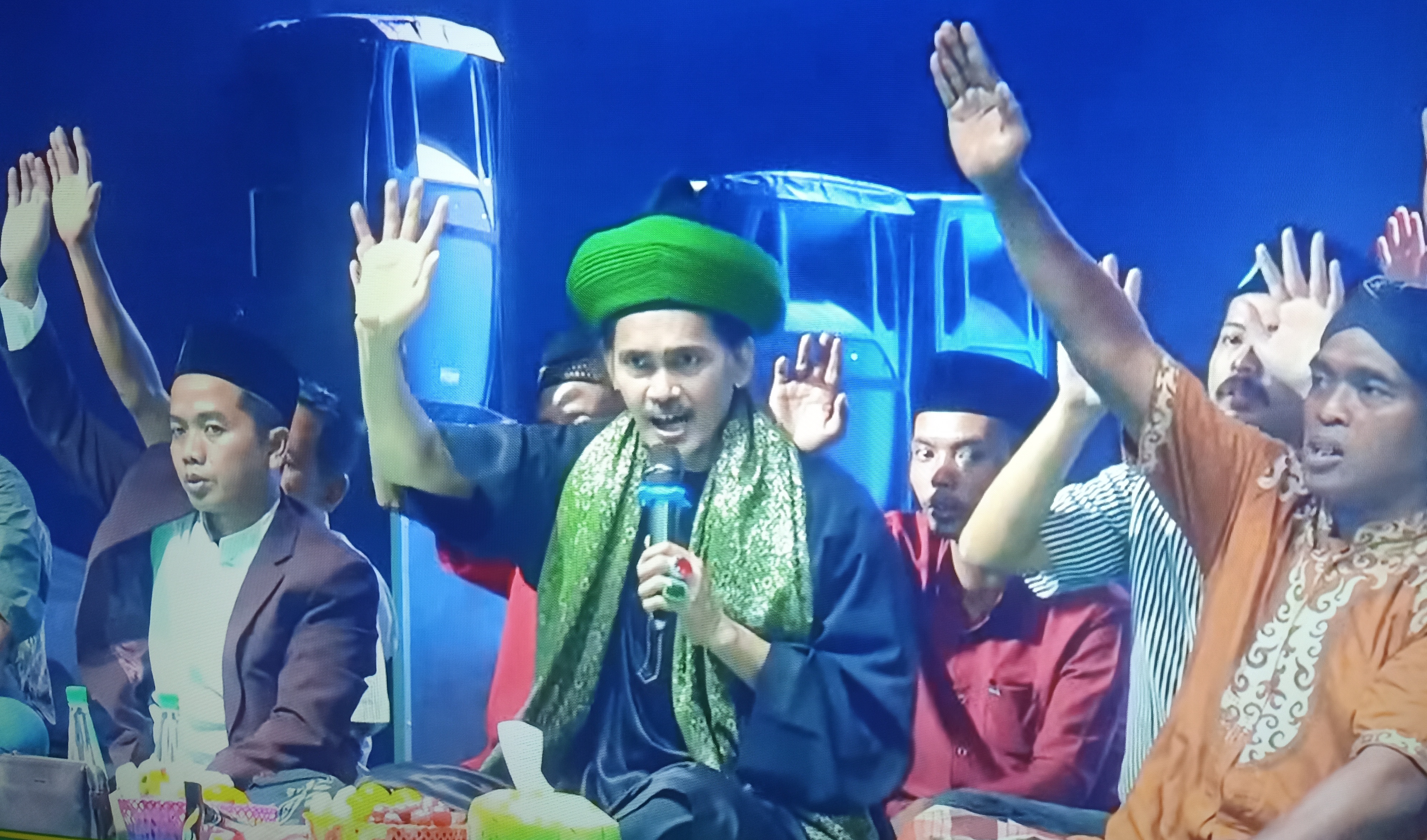 Abah Ali Mafia Shalawat saat mengajak ribuan warga untuk terus melantunkan shalawat sambil tangan diatas.