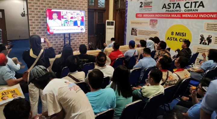 SURABAYAPAGI.COM, Surabaya – Debat ketiga calon presiden (capres) Pemilu 2024 yang digelar di Istora Senayan, semalam, juga ditonton para pendukungnya di Surabaya. Seperti yang dilakukan oleh Tim Pemenangan Daerah (TPD) Ganjar-Mahfud dan Tim Kemenangan Daerah (TKD) Prabowo-Gibran di Surabaya. TPD Ganjar-Mahfud, melalui PDIP, partai pengusung utamanya, nonbar di kampung-kampung. Sementara untuk TKD Prabowo-Gibran Jatim di Posko pusat TKD Prabowo-Gibran di sebuah rumah kawasan elite di Jalan Diponegoro Surabaya.