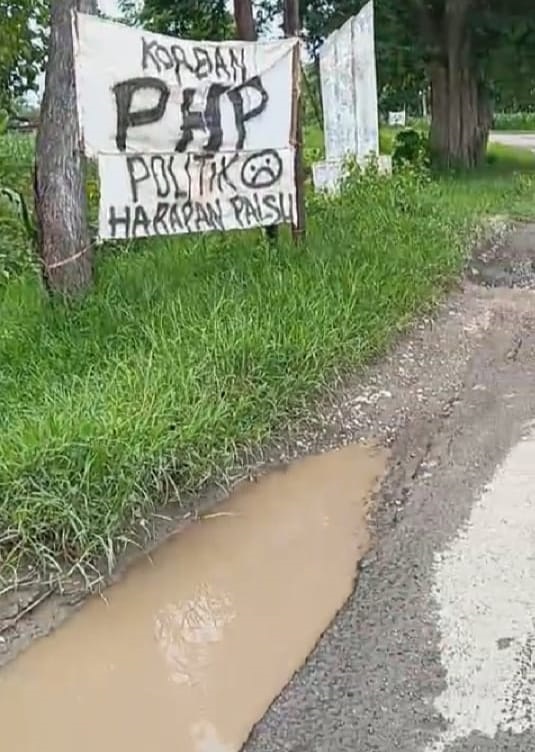 Spanduk yang dipasang diantara dua pohon itu masing-masing bertuliskan "Apa Kabar Bupati, Jangan Lupa Sama Janjimu", Sedangkan spanduk lainnya bertuliskan "Korban PHP, Politik Harapan Palsu".