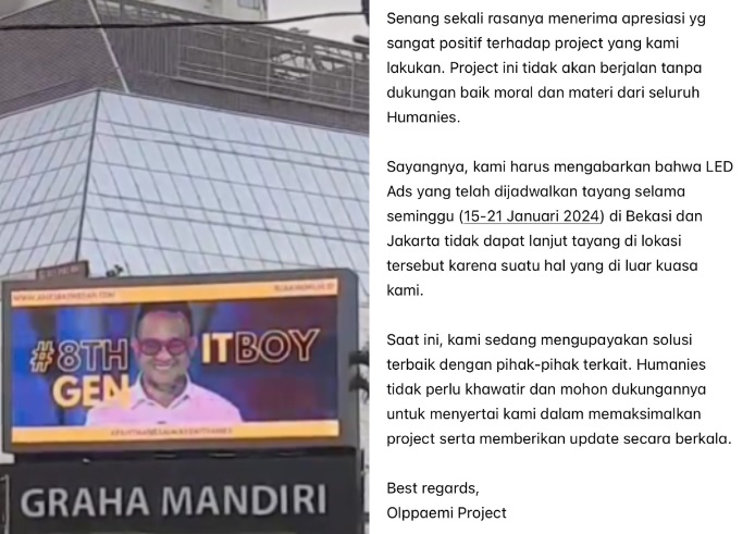 Menurut, Olppaemi Project yang merupakan penyelenggara proyek yang memasang iklan videotron Anies Baswedan, mengatakan seharusnya iklan Anies itu tayang selama seminggu, yaitu 15-21 Januari 2024 di Bekasi dan Jakarta. Namun, baru sehari tayang sudah tidak bisa dilanjutkan karena sesuatu hal yang tak ia sebutkan.
