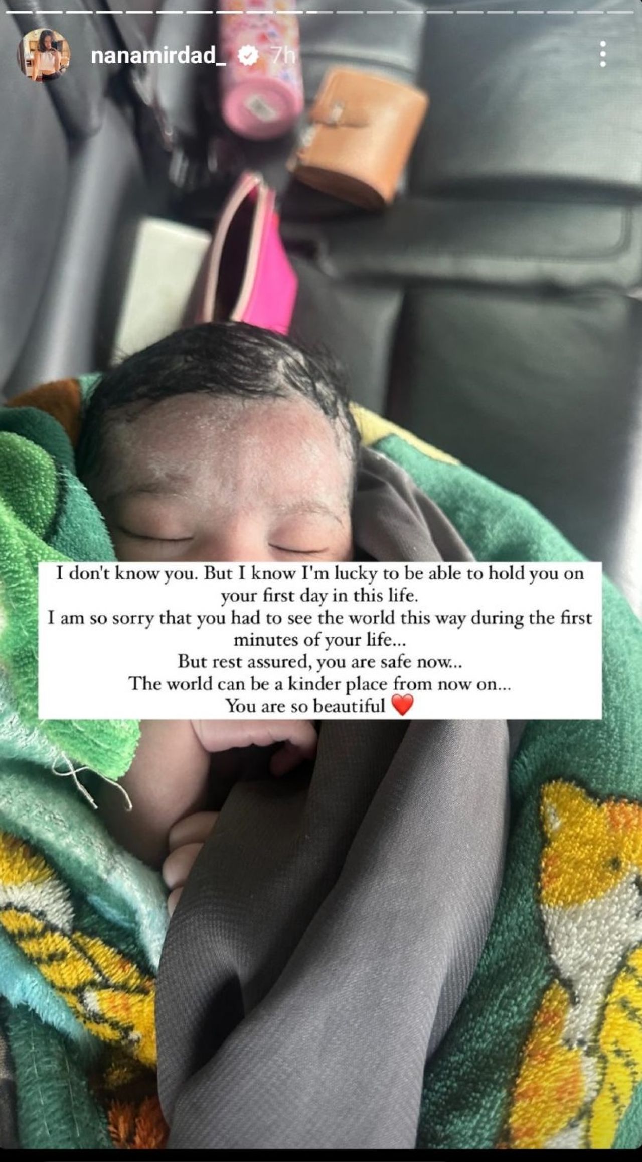 Melalui akun Instagram nya @nanamirdad_ ia mengunggah foto bayi dengan ditutupi caption: "Siang ini emba di rumah nemuin bayi baru lahir dibuang di semak-semak dekat rumah.