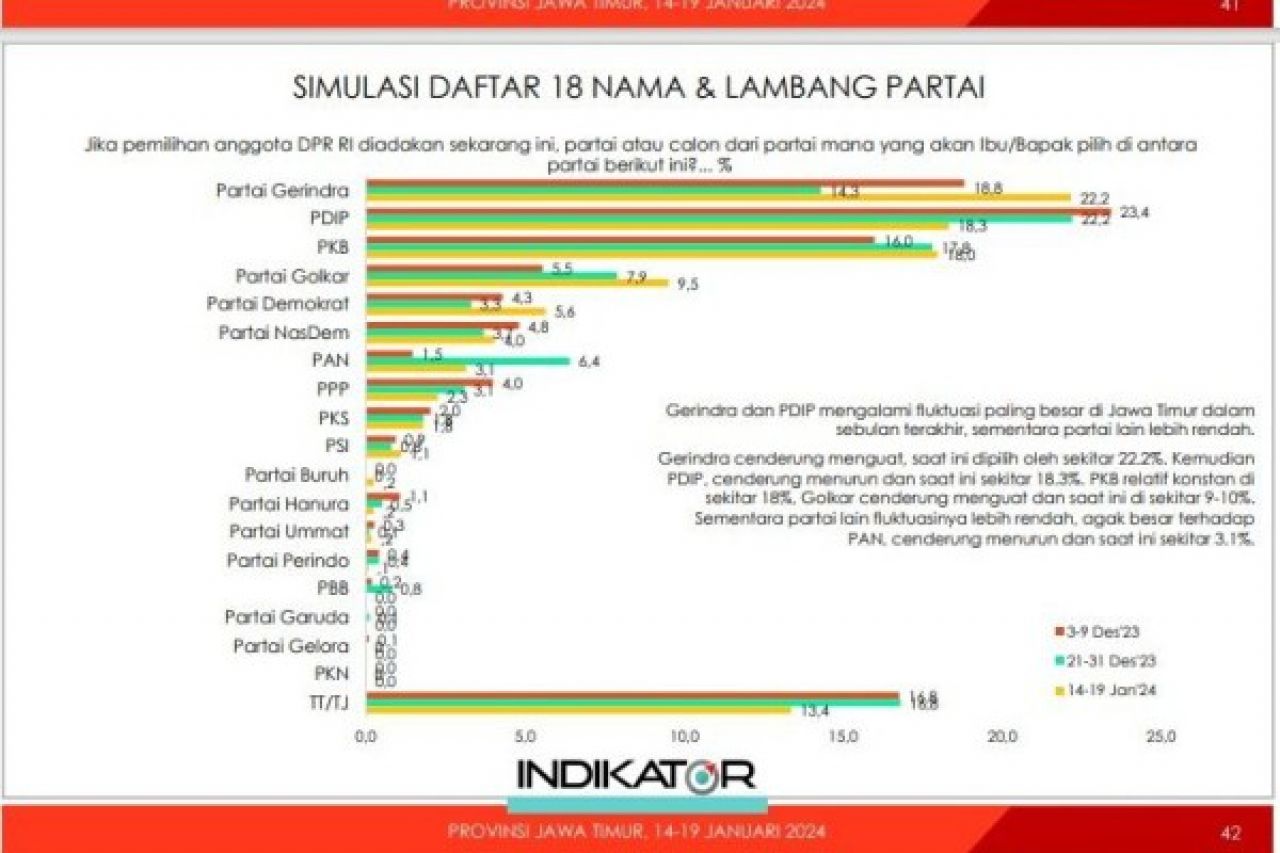 Dalam survei elektabilitas partai politik di Jawa Timur versi Indikator Politik, Partai Gerindra menyalip PDI Perjuangan (PDIP) dan PKB.