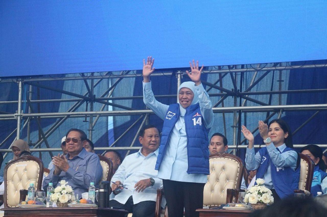 "Pak Prabowo akan menjadi penerus Pak Jokowi dan Pak SBY memimpin Indonesia. Kalau demokrat menang, siapa presidennya?," tanya Khofifah ke massa yang berjubel di lapangan Gajayana. “Prabowo,” jawab massa Penuh semangat.