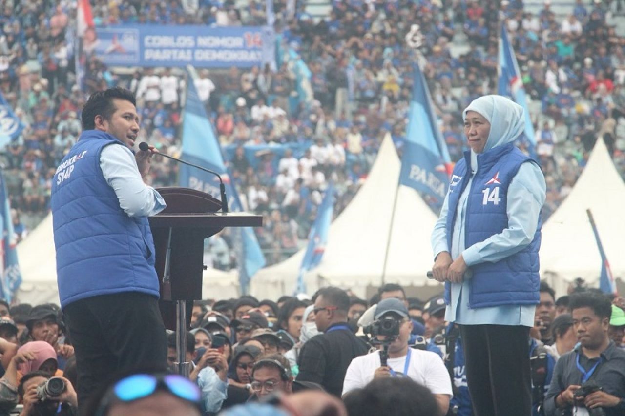 Khofifah yang memakai jaket bertuliskan AHY 14 Demokrat S14P warna biru, persis sama dengan jaket yang dikenakan AHY dan Emil Dardak. Khofifah pun meminta masyarakat mencoblos Nomer 14 dan Prabowo - Gibran di 14 Februari nanti. “Bismillah presidennya coblosnya nomor 2 dan (partai) Demokrat nomer 14," sambung Gubernur Jatim ini.