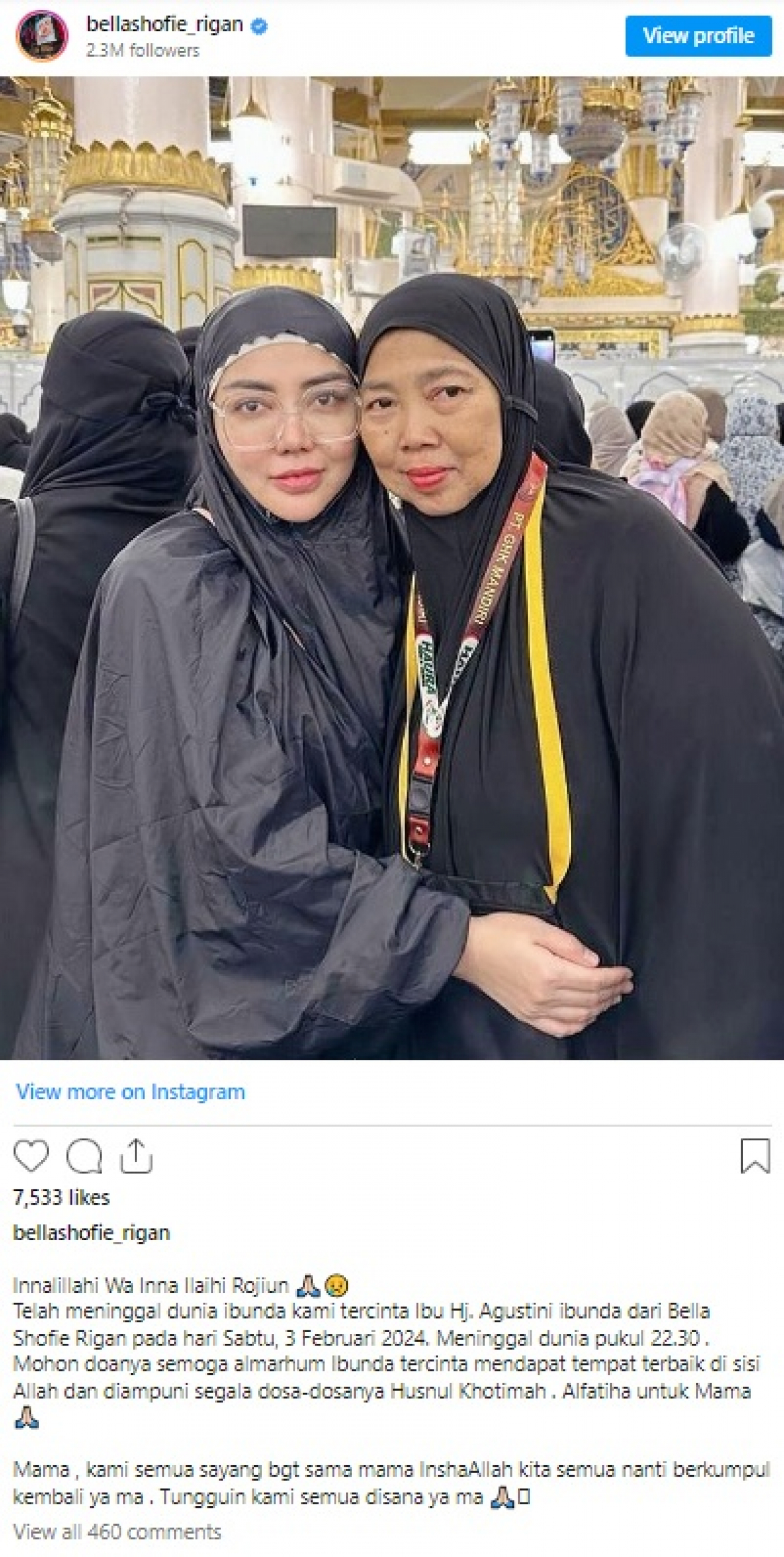 “Innalillahi Wa Inna Ilaihi Rojiun. Telah meninggal dunia ibunda kami tercinta Ibu Hj. Agustini ibunda dari Bella Shofie Rigan pada hari Sabtu, 3 Februari 2024. Meninggal dunia pukul 22.30,” tulis caption unggahan Bella Shofie, dilihat Minggu (04/02/2024).