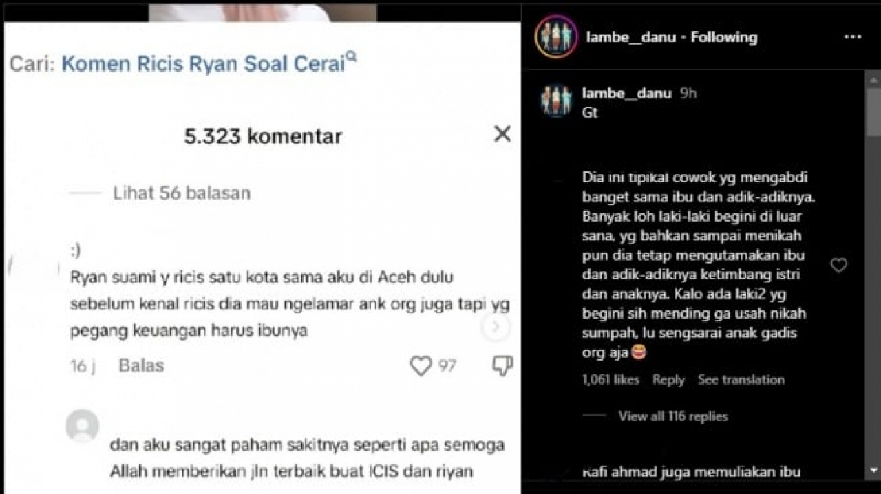 "Ryan suaminya Ricis satu kota sama aku di Aceh. Dulu sebelum kenal Ricis, dia mau ngelamar anak orang juga tapi yang pegang keuangan harus ibunya," komentar seorang warganet yang dilihat di akun Instagram @lambe__danu, dilihat Senin (05/02/2024).
