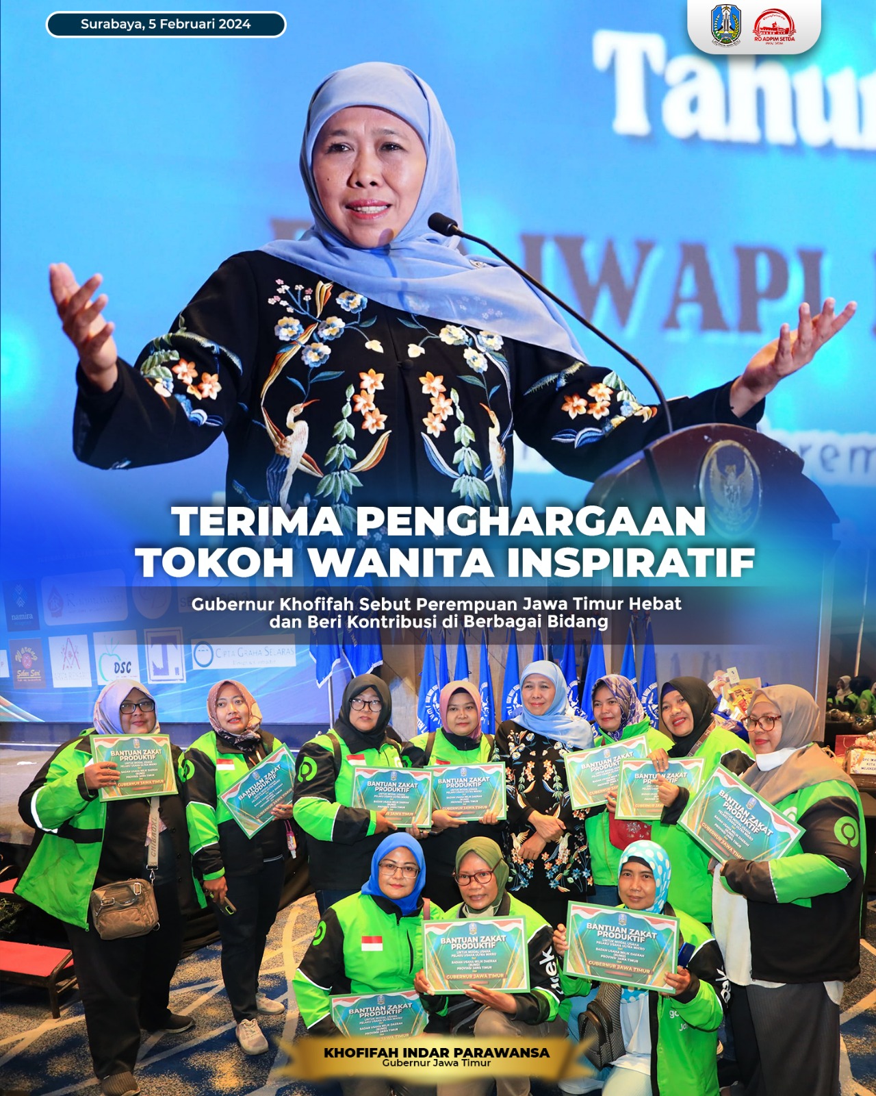Khofifah juga memberikan tali asih secara simbolis pada 25 orang driver ojol perempuan binaan DPD IWAPI Jatim. Ia juga mengajak IWAPI Jatim untuk terus berkolaborasi dan bersinergi dengan berbagai dinas terkait untuk mendukung peran perempuan pengusaha di Jatim.