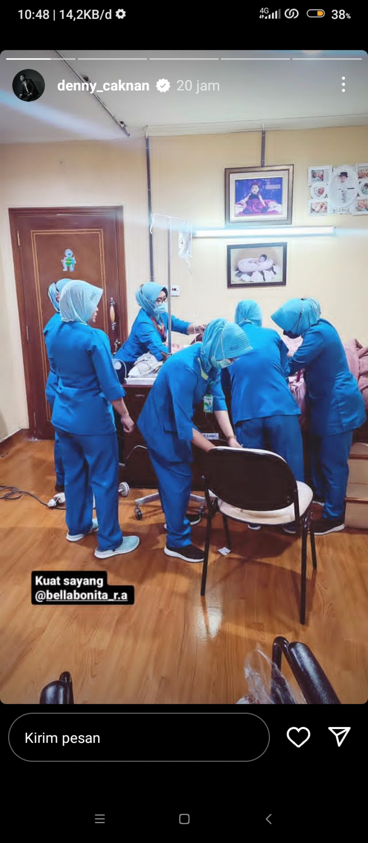 Hal itu diketahui dari unggahan Instagram Story milik Denny Caknan. pelantun Los Dol itu menyemangati sang istri agar tetap kuat saat Bella Bonita tengah ditangani beberapa suster.