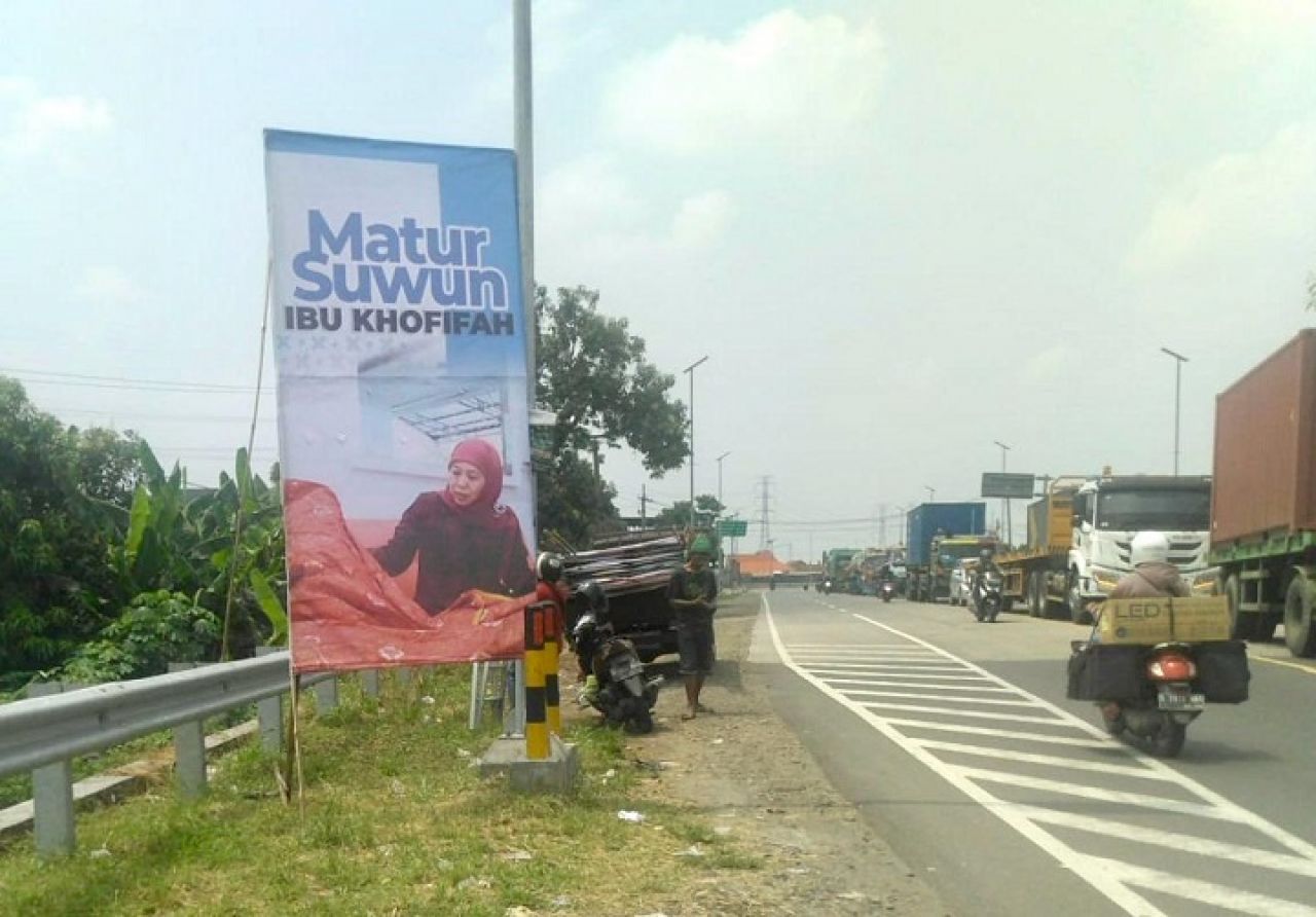 Spanduk besar bergambar Khofifah itu bertuliskan banyak pesan. Mulai dari 'Matur Suwun Ibu Gubernur Khofifah', 'Mator Sakalangkong Ibu Khofifah', Terima Kasih Ibu Gubernur.. Lanjutkan Dua Periode', hingga pantun Makan nasi pakai buah Terima Kasih Ibu Khofifah.