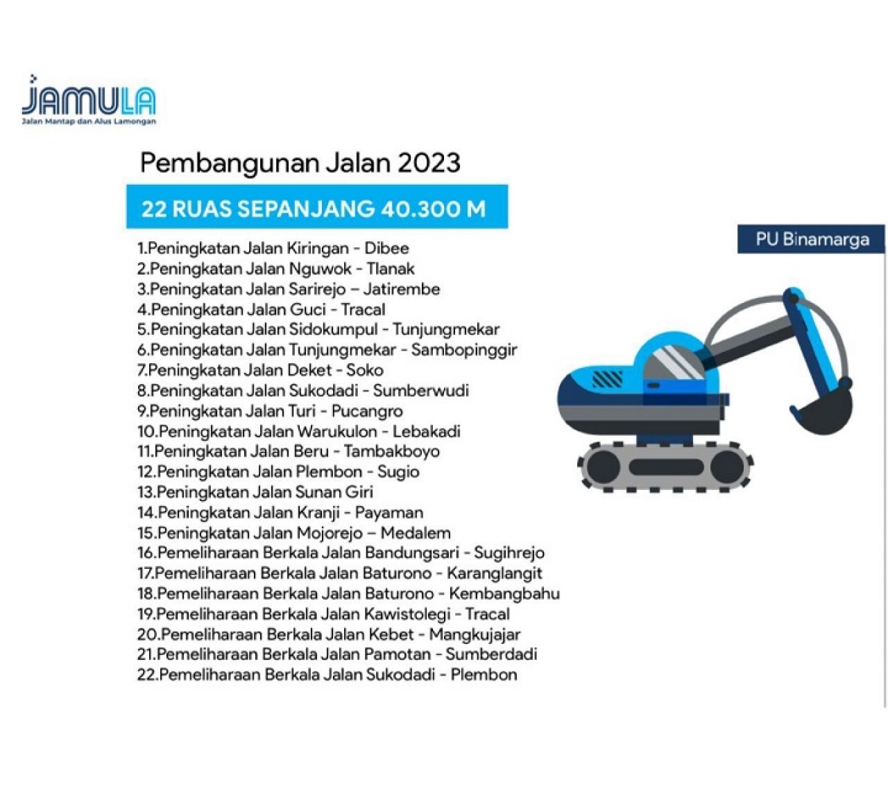 Di Lamongan sendiri, seperti informasi yang diterima surabayapagi.com untuk pembangunan jalan mantab Lamongan (Jamula) menyebutkan, pada tahun 2023 lalu, ada 22 ruas jalan yang dibangun dengan nilai Rp 40,3 miliar.