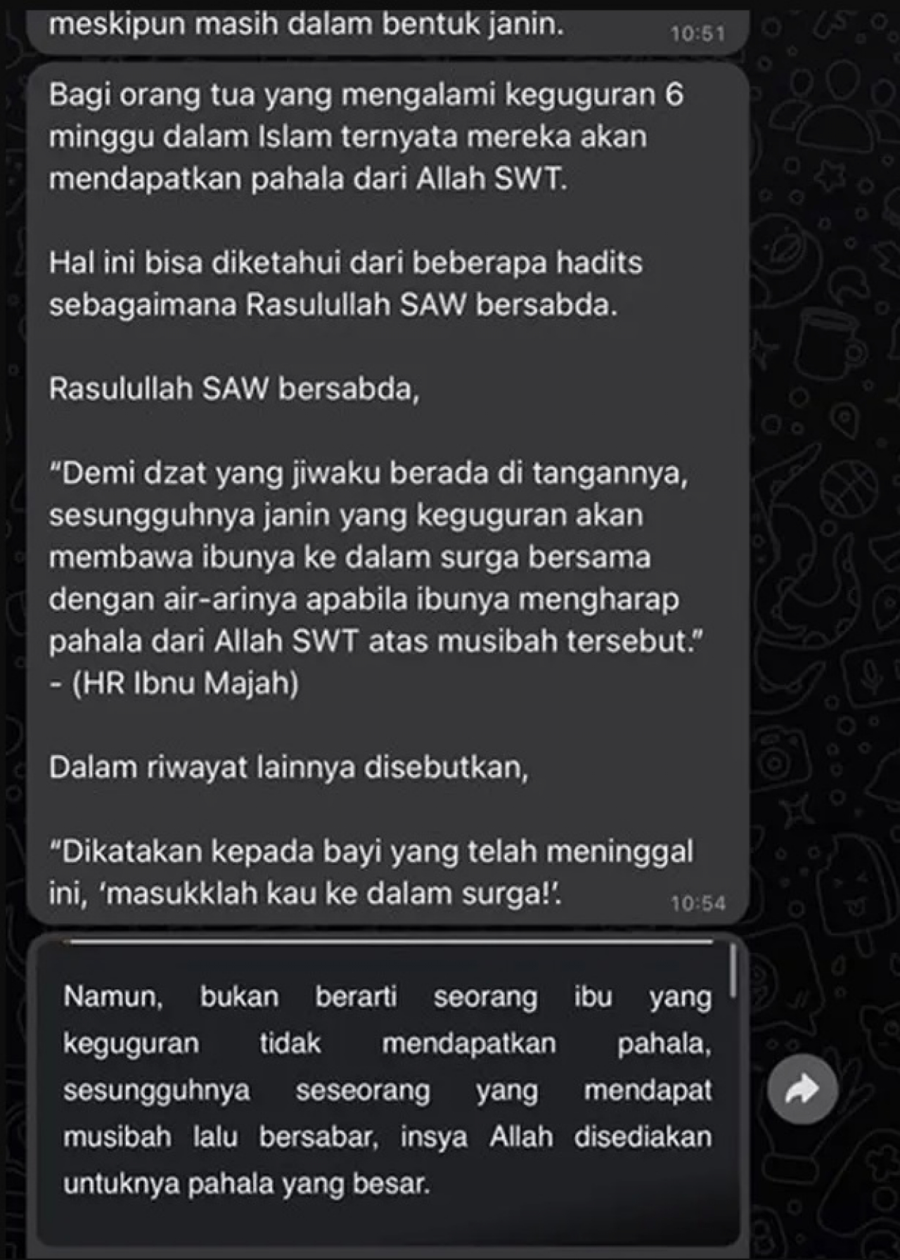 Dalam unggahannya tersebut, Nikita Willy memperlihatkan capture chat dengan suaminya. Di mana Indra memberikan dukungan kepadanya. Ia bahkan mengutip salah satu hadits tentang pahala bagi seorang ibu yang keguguran.