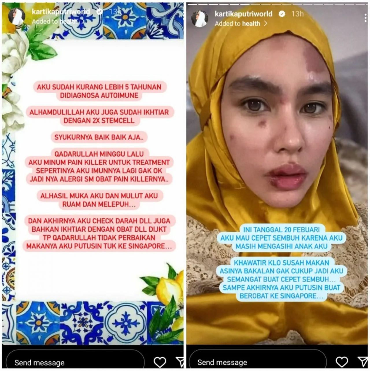 Ternyata, sudah 5 tahun Kartika Putri didiagnosa mengidap autoimun. Untuk mengatasinya, dia sudah dua kali menjalani stemcell dan keadaannya baik-baik saja. Hingga datang satu hari yang menyebabkan sakit itu datang.