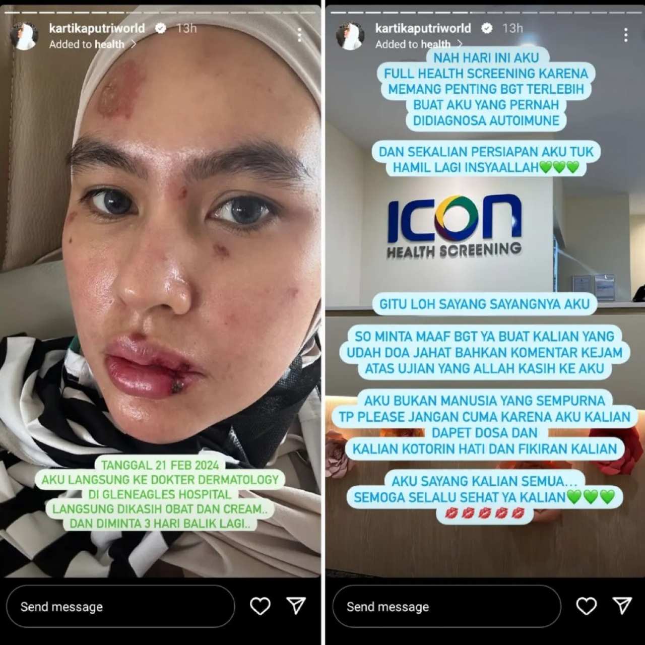 "Gitu loh sayangnya aku. So, minta maaf banget ya buat kalian yang sudah doa jahat bahkan komentar kejam atas ujian yang Allah kasih ke aku. Aku bukan manusia sempurna tapi please jangan cuma karena aku kalian dapat dosa dan kalian kotori hati dan pikiran kalian," ucap Kartika Putri.