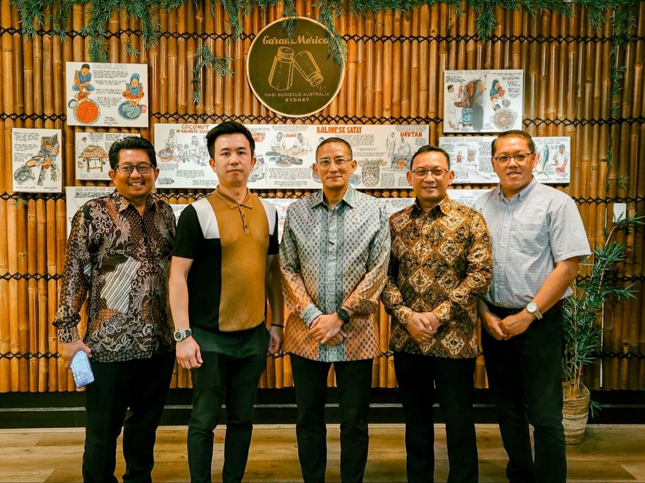 SurabayaPagi, Sydney - Menteri Pariwisata dan Ekonomi Kreatif Sandiaga Uno beserta Bapak Vedi Kurnia Buana selaku Konjen RI di Sydney menyempatkan waktunya untuk makan siang di restaurant Halal Garam Merica Sydney yang terkenal dengan Nasi Bungkus ala warung di Sydney.