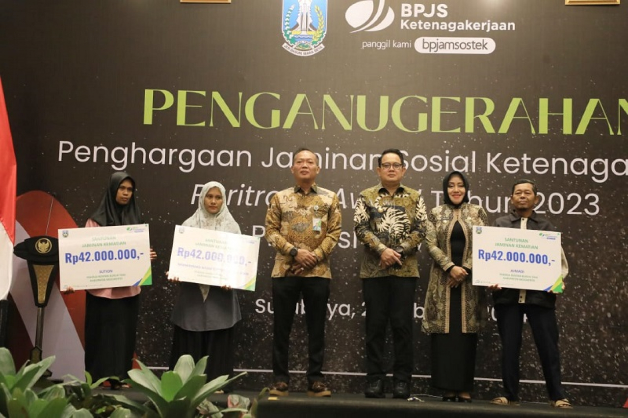 Dalam kesempatan itu, Pj. Gubernur Adhy didampingi Kepala Kantor Wilayah (Kakanwil) BPJS Ketenagakerjaan Jatim menyerahkan santunan kematian kepada tiga ahli waris pekerja rentan buruh tani yang masing-masing mendapatkan santunan sebesar Rp. 42.000.000,-.
