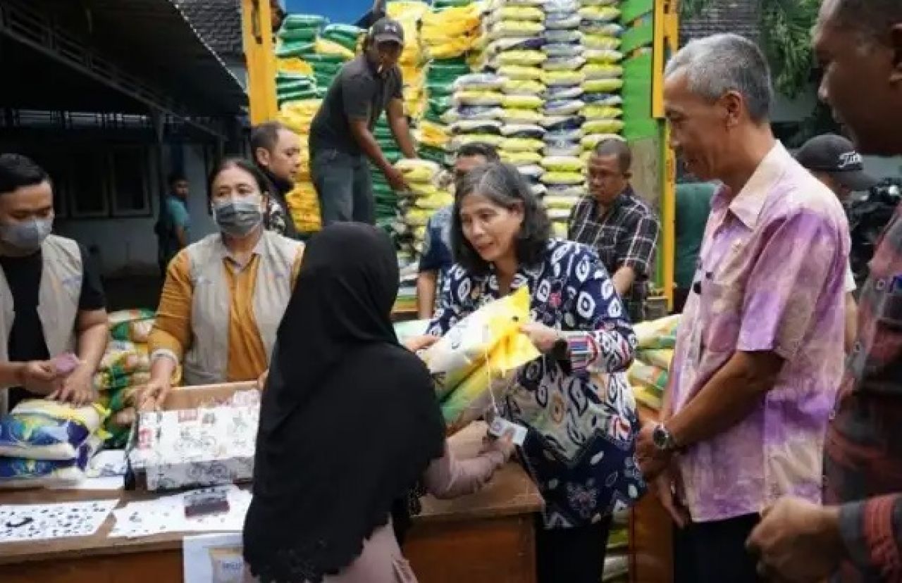 Pj Wali Kota Kediri Zanariah turut serta melayani masyarakat yang sedang membeli beras.
