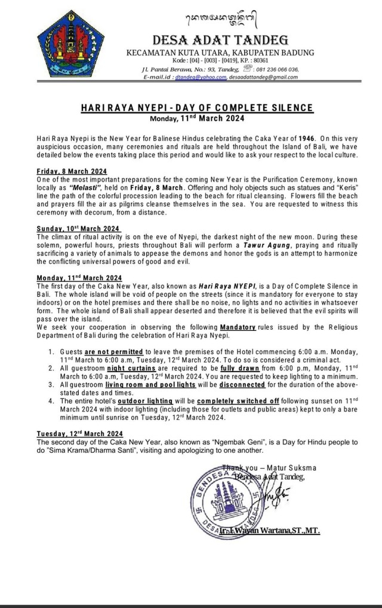 Namun, Wartana menegaskan, jika pihaknya sebelumnya telah mengeluarkan surat imbauan berisi tata tertib pelaksanaan Nyepi baik untuk warga dan turis dalam bahasa Indonesia dan Inggris.