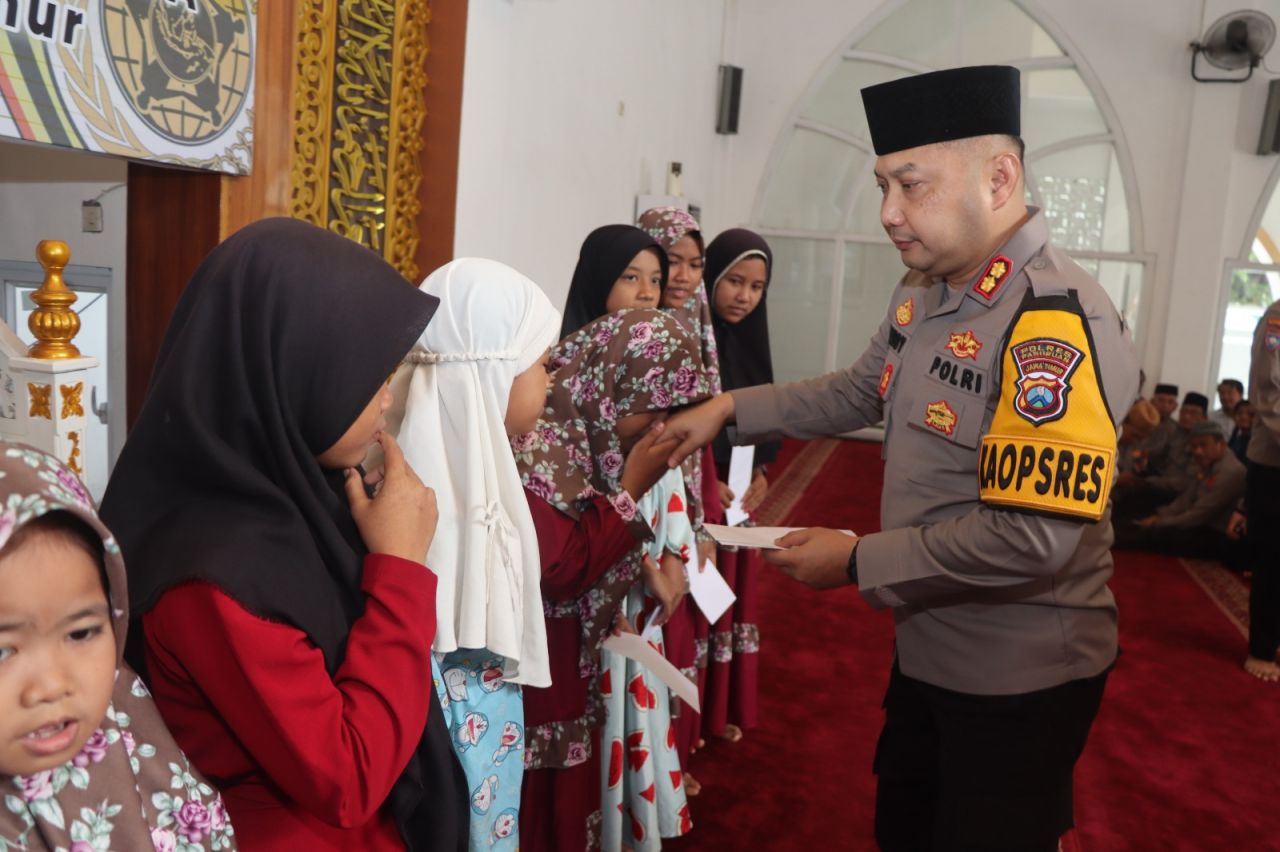 Selanjutnya, acara dilanjutkan dengan pemberian santunan oleh Kapolres Pasuruan bersama PJU Polres Pasuruan kepada Anak Yatim Piatu yang hadir.