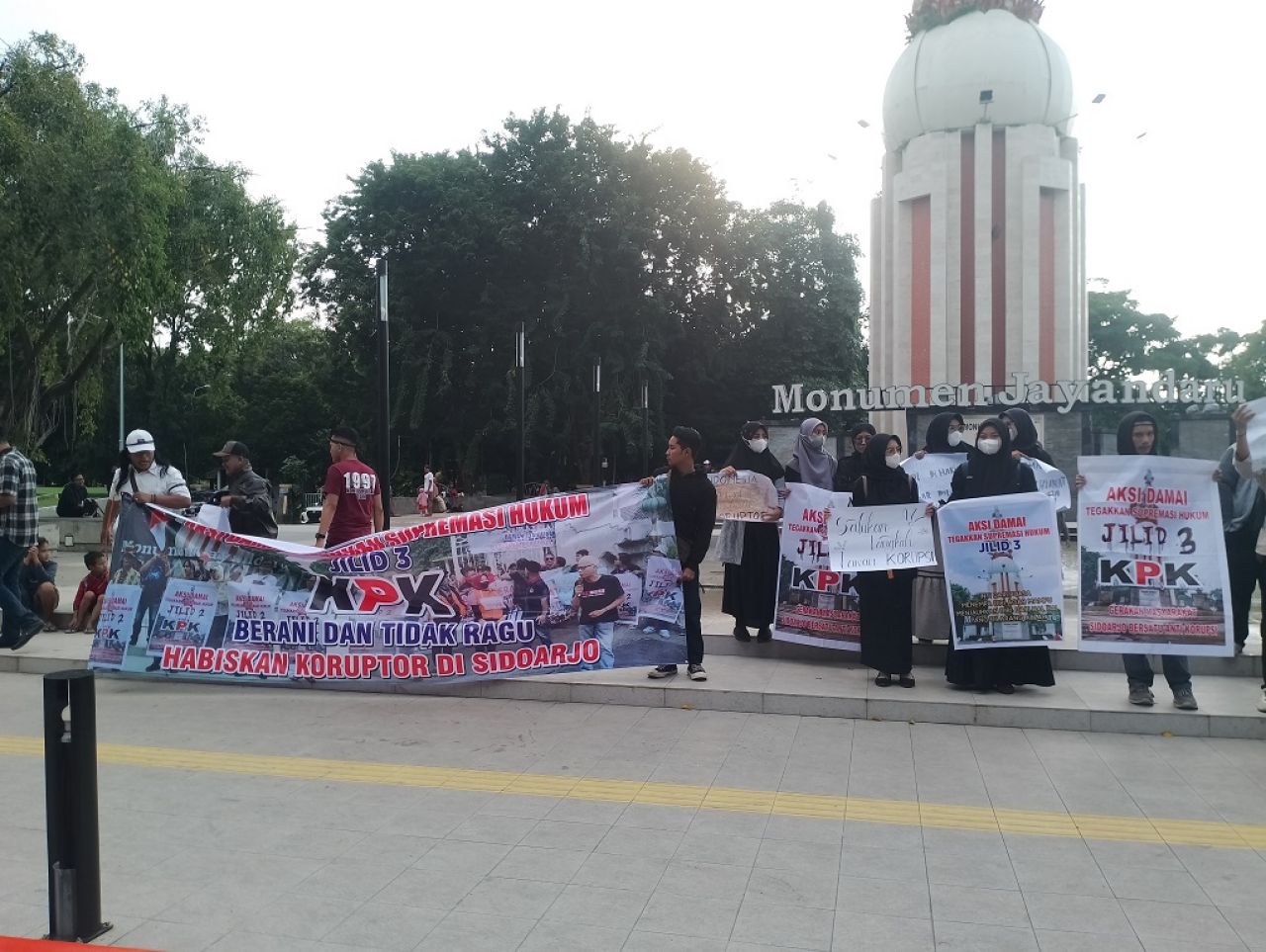Gerakan Masyarakat Sidoarjo Bersatu (GMSB) kembali menggelar aksi unjuk rasa di Monumen Jayandaru Alun-alun Sidoarjo mendukung Komisi Pemberantasan Korupsi (KPK) untuk mengusut tuntas kasus korupsi di Kantor Badan Pelayanan Pajak Daerah (BPPD) Kabupaten Sidoarjo, Kamis (21/3/2024).