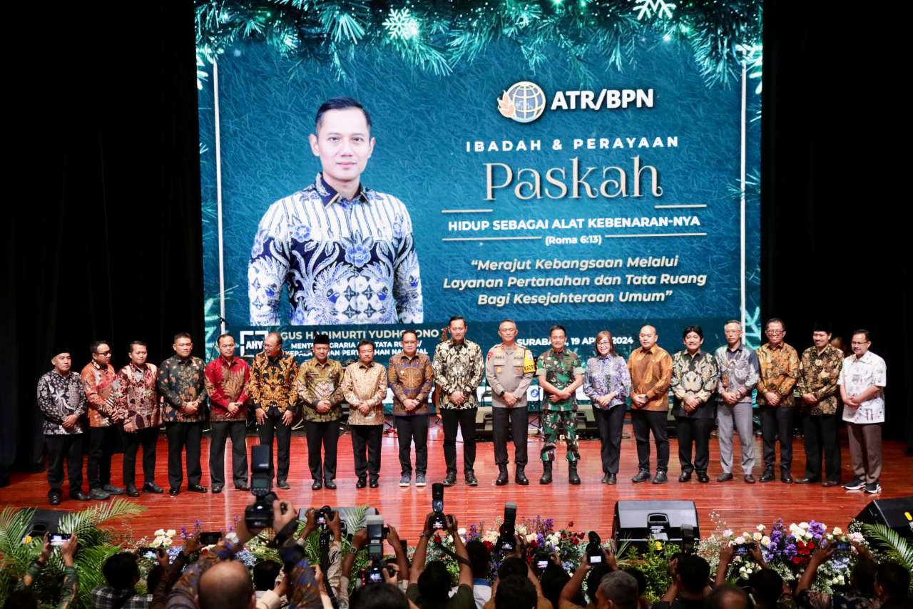 SURABAYAPAGI, Surabaya - Penjabat (Pj) Gubernur Jawa Timur Adhy Karyono bersama Menteri Agraria dan Tata Ruang/ Kepala Badan Pertanahan Nasional (ATR/BPN) Agus Harimurti Yudhoyono menghadiri perayaan paskah bersama umat Nasrani sekaligus menyerahkan sertipikat tanah untuk tempat atau rumah peribadatan di Hall Ciputra, Surabaya, Jumat (19/4/2024).