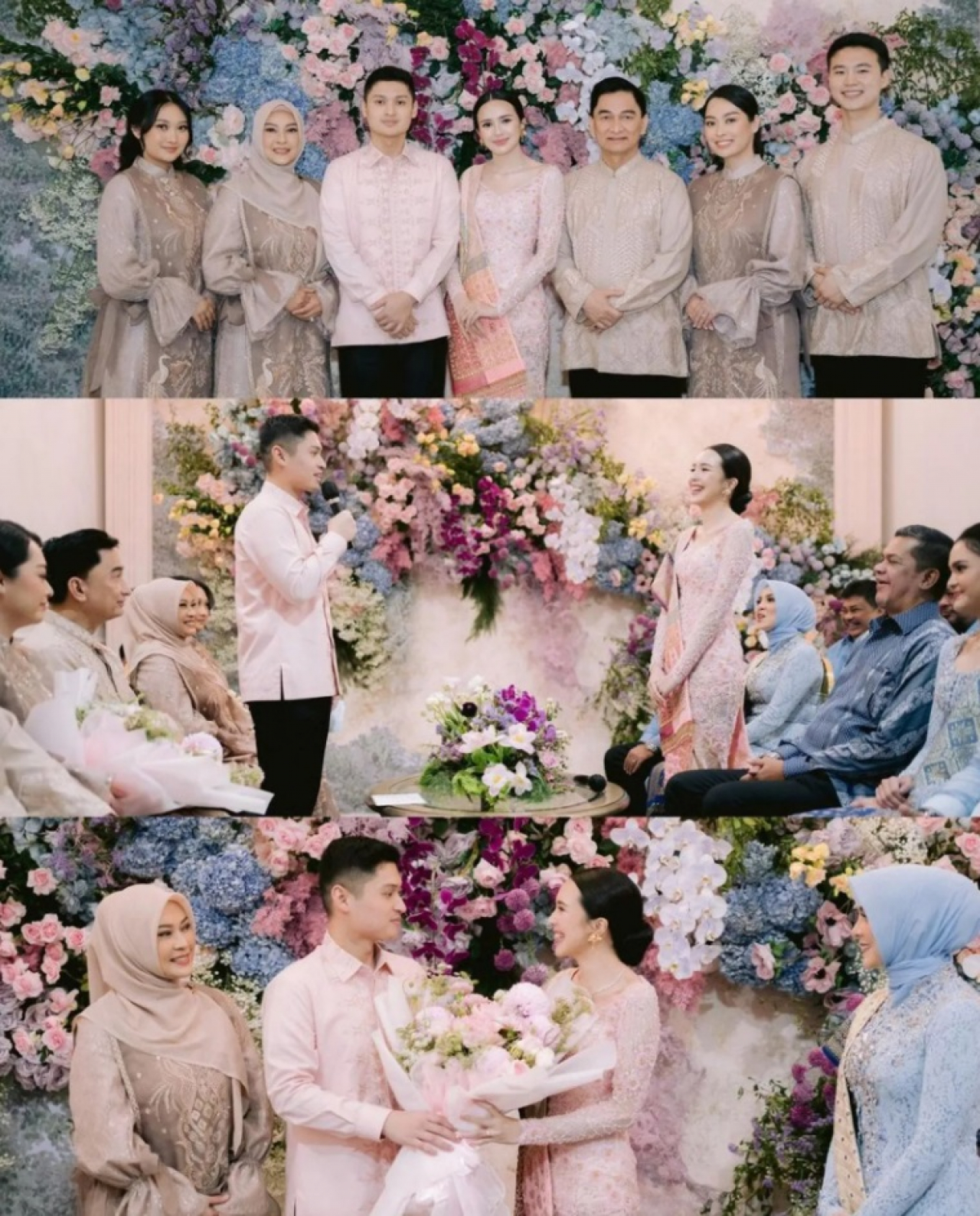 Kediaman Beby Tsabina yang menjadi lokasi lamaran pun disulap menyerupai taman romantis dengan rangkaian bunga-bunga segar yang didominasi rona pastel bernuansa merah muda.
