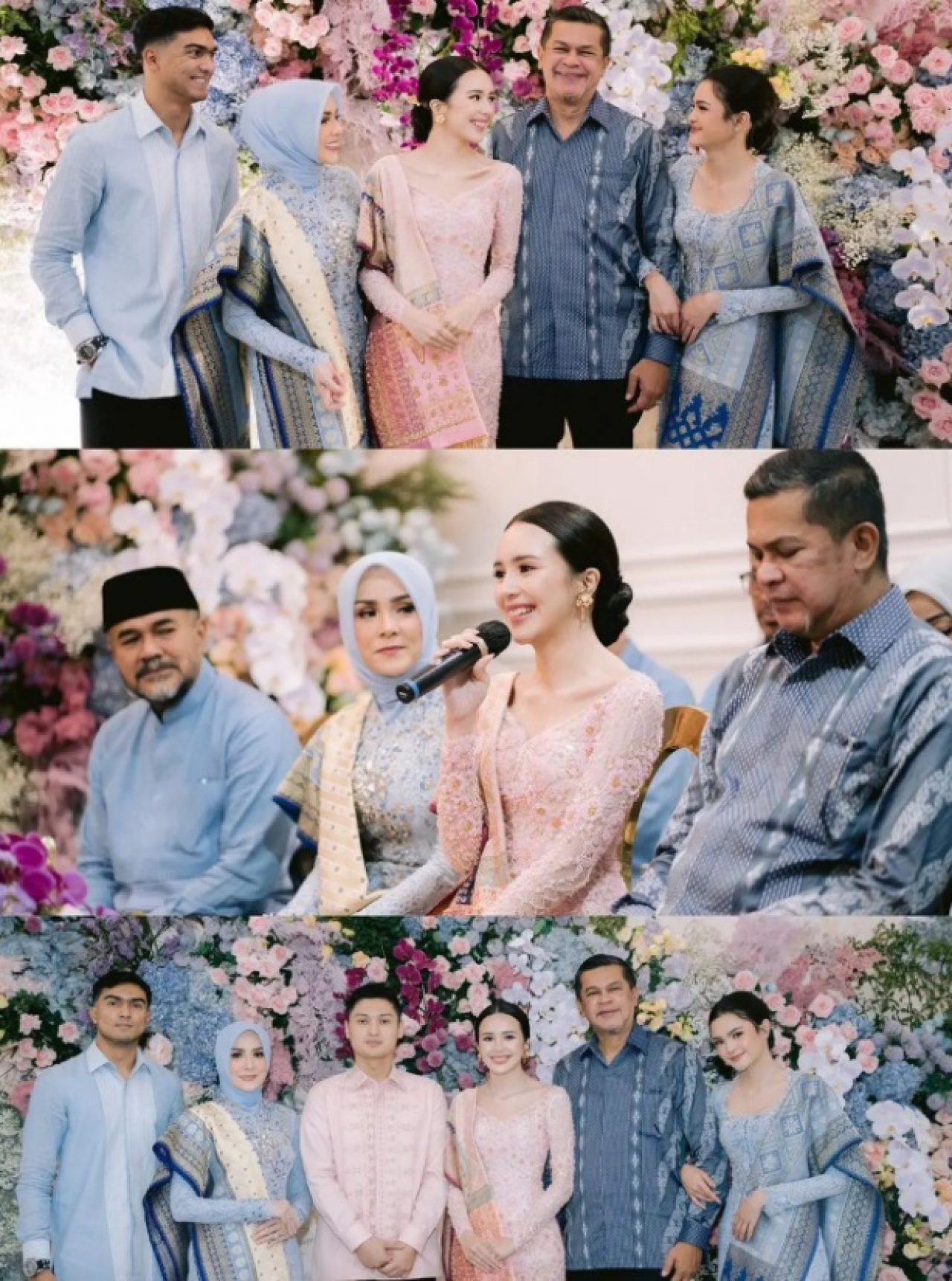 Di sisi lain, Rizki Natakusumah tampak gagah dengan busana berwarna merah muda, selaras dengan nuansa warna pastel sebagai palet utama acara pertunangan mereka.