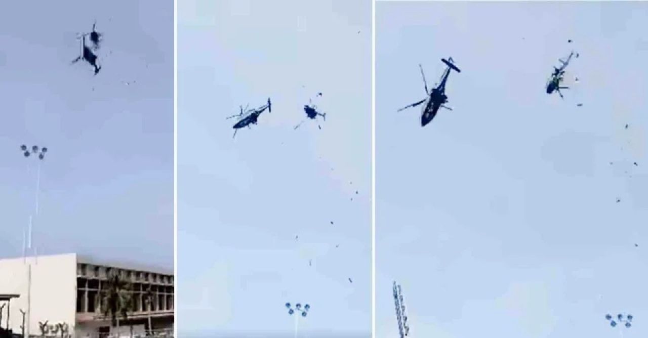 Video kejadian tersebut menunjukkan salah satu helikopter menghantam rotor helikopter lainnya sebelum keduanya jatuh ke tanah.