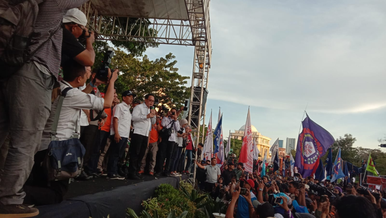 Menemui ribuan massa tersebut, Adhy Karyono, Pj Gubernur Jatim, menyampaikan siap memenuhi janji dengan mengakomodir 12 tuntutan buruh sebagai bentuk komitmen Pemprov Jatim.