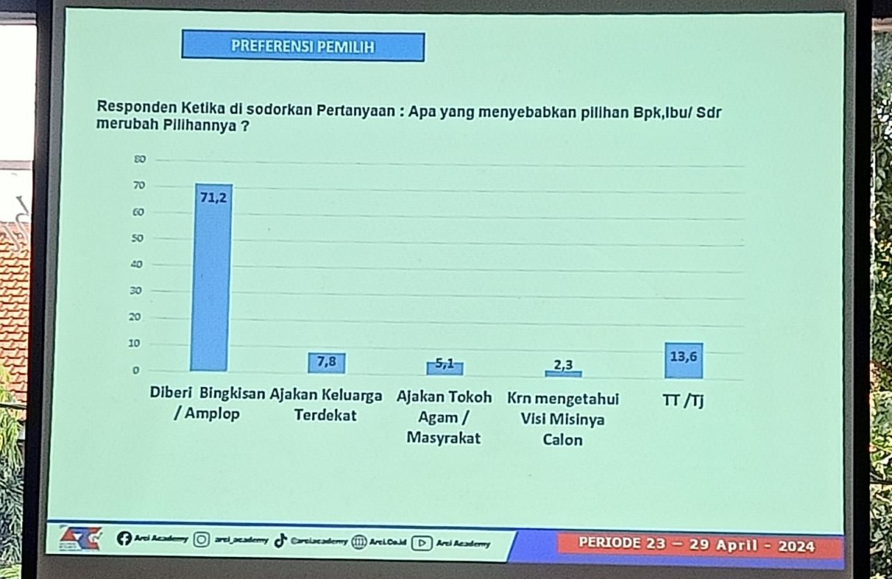 Dalam survei yang dilakukan pada periode 23-29 April 2024 tersebut tambah Baihaki, responden disodorkan pertanyaan apa yang menyebabkan bapak/ibu/sdr merubah pilihan nya, rinciannya sebanyak 71,2 persen karena menerima amplop dan bingkisan.