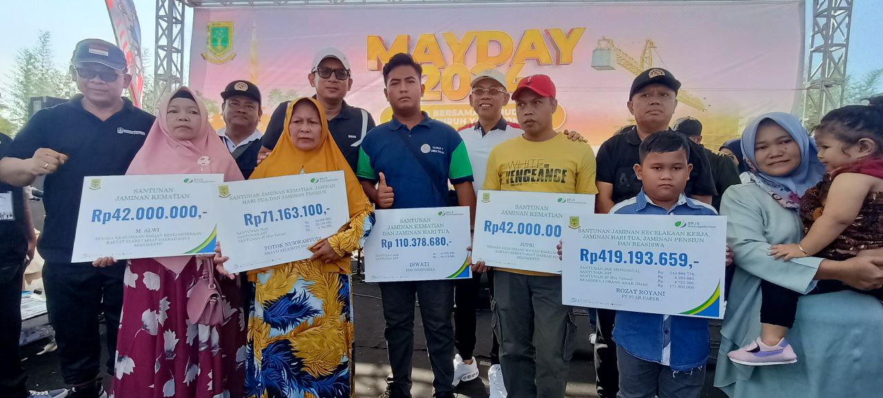 Penyerahan santunan kematian dilakukan bersamaan dengan kegiatan jalan sehat merayakan Hari Buruh Internasional (Mayday) 2024 di Halaman GOR dan Seni Mojopahit Kota Mojokerto, Minggu (12/5/2024) pagi.