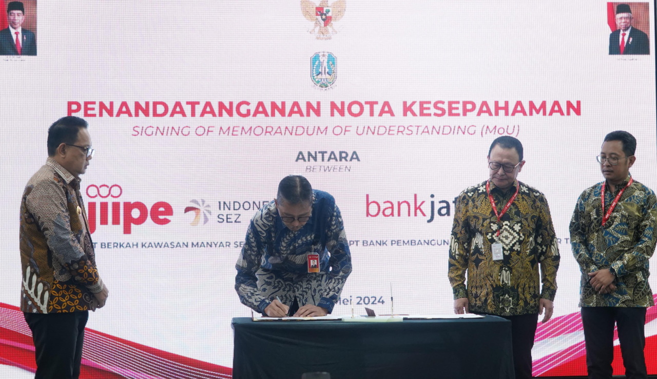 Bertempat di JIIPE, penandatanganan MoU dilakukan oleh Direktur Utama Bank Jatim Busrul Iman dan Direktur Utama PT Berkah Kawasan Manyar Sejahtera Bambang Soetiono S. serta Direktur Keuangan PT Berkah Kawasan Manyar Sejahtera Ifan Johar Kuswahyudi pada hari Senin (13/5/2024).