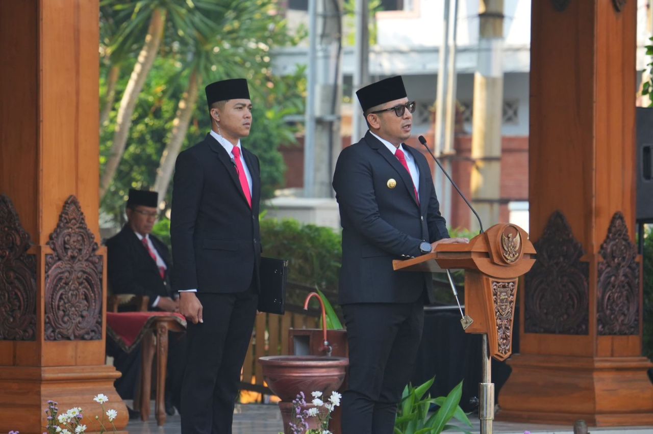 Dalam Kesempatan ini Penjabat (Pj.) Wali Kota Mojokerto M. Ali Kuncoro selaku Inspektur Upacara membacakan pidato sambutan Menteri Komunikasi dan Informatika Republik Indonesia, Budi Arie Setiadi.