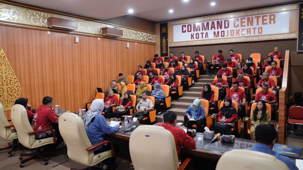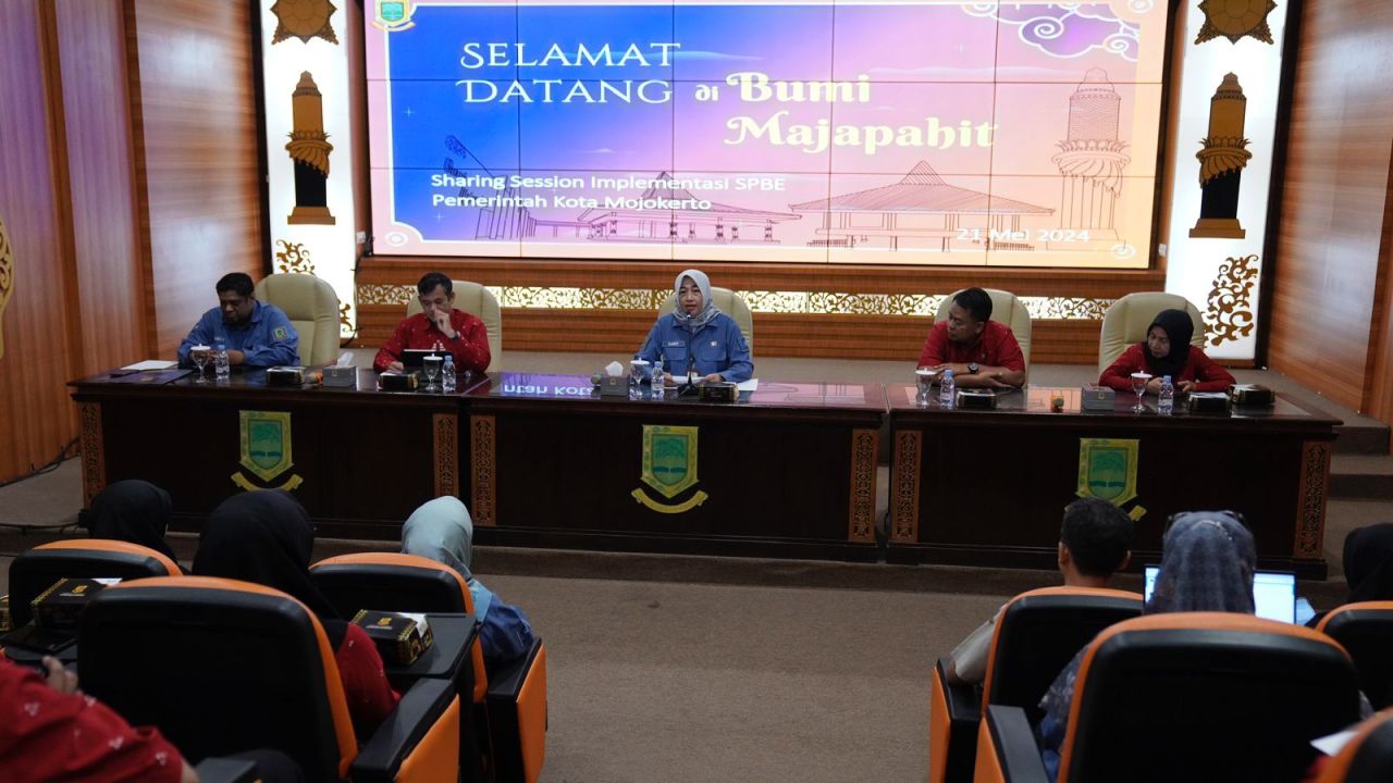 SURABAYAPAGI.COM, Mojokerto - Keberhasilan implementasi Sistem Pemerintahan Berbasis Elektronik (SPBE) di Kota Mojokerto menjadi lokus bagi Pemerintah Kota Blitar dalam sharing session antara Dinas Komunikasi dan Infomatika (Diskominfo) Kota Mojokerto dengan Dinas Komunikasi, Informatika dan Statistik (Diskominfotik) Kota Blitar di Ruang Command Center, Balai Kota Mojokerto pada Selasa (21/5).