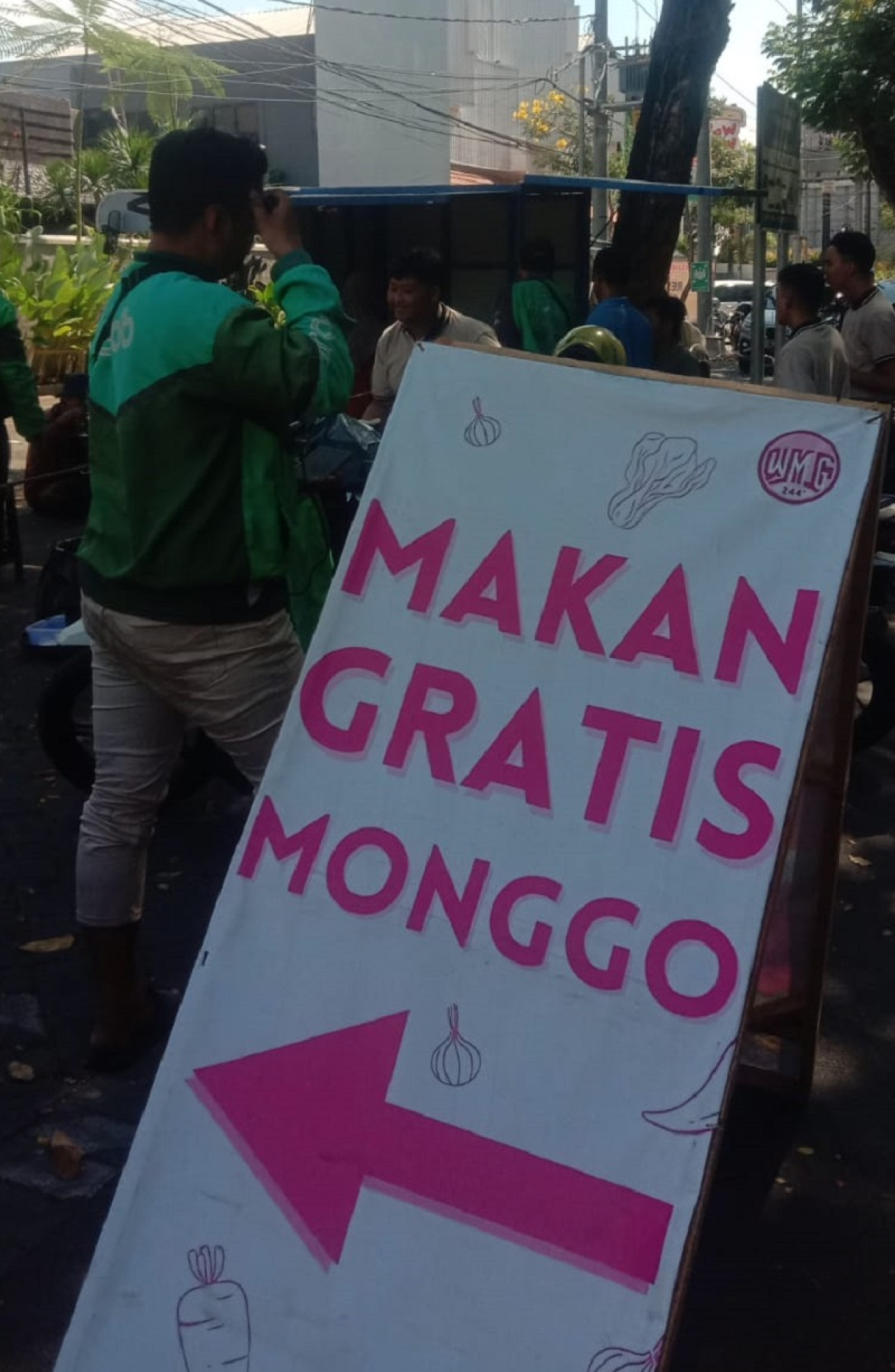 Ada yang mencolok pinggir jalan yaitu banner putih bertuliskan "Makan gratis monggo" menjadi perhatian para pengguna jalan, sehingga bagi yang belum sarapan langsung berhenti mencobanya.