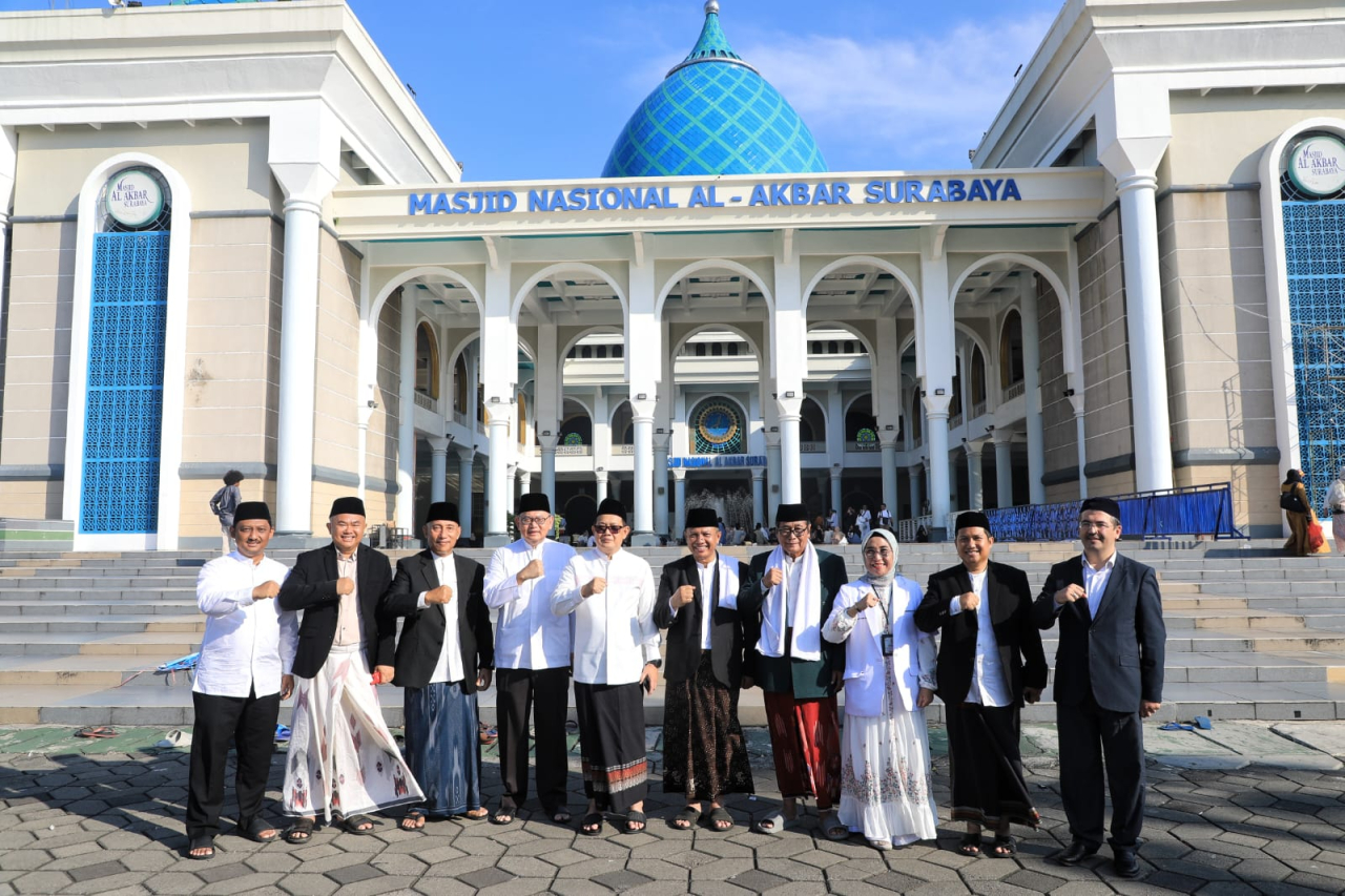 SURABAYAPAGI.COM, Surabaya - Penjabat Gubernur Jawa Timur Adhy Karyono menjalankan sholat Idul Adha di Masjid Nasional Al-Akbar Surabaya, Senin (17/6) pagi. Selepas sholat, Pj. Gubernur Adhy turut menyerahkan secara simbolis sapi kurban Presiden RI Joko Widodo kepada Masjid Raya Islamic Center Provinsi Jawa Timur yang diterima oleh H Imam Basori, MM Ketua Badan Pengelola Masjid Raya Islamic Center Provinsi Jawa Timur.