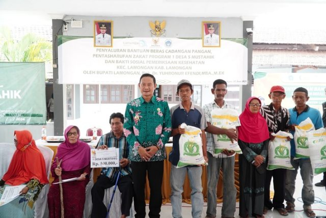 SURABAYAPAGI.COM, Lamongan - Bupati Lamongan Yuhronur Efendi turun langsung dan memastikan pentasyarufan (penyerahan) bantuan program unggulan Badan Amil Zakat Nasional (Baznas), yakni satu desa lima mustahik dan bantuan pangan (Banpang) dari Kementerian Koordinator Bidang Pembangunan Manusia dan Kebudayaan Republik Indonesia melalui Perum Bulog sesuai sasaran.