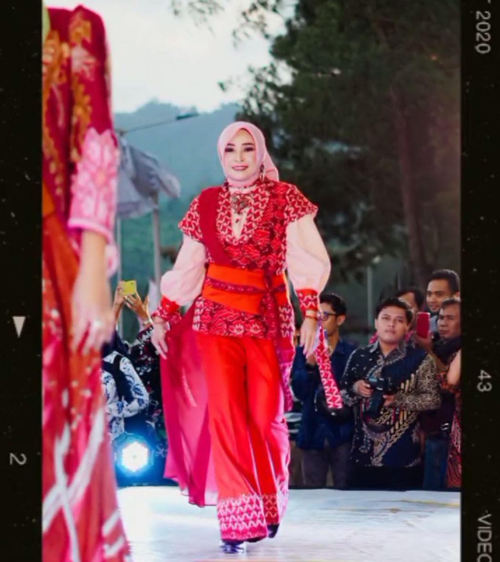 Bunda Nia menggunakan busana merah berbahan sarung tenun Betel Terbang, produk asli IKM Kota Mojokerto, yang berpusat di Jalan Pemuda Mojokerto, dan memiliki rumah produksi di Kediri dan Jombang.