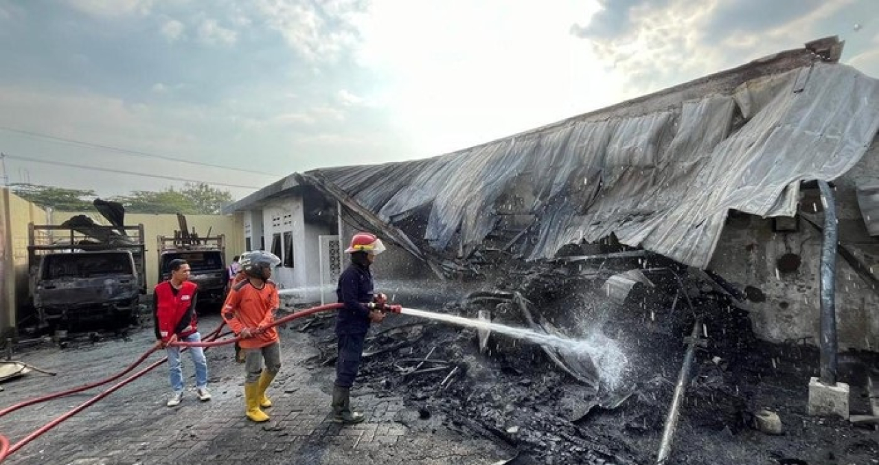 SURABAYAPAGI.COM, Mojokerto - Kebakaran hebat melanda pabrik pengeringan plastik di Desa Mlaten, Puri, Mojokerto. Selain meludeskan mesin oven dan 2 truk, insiden ini juga melukai seorang karyawan.
