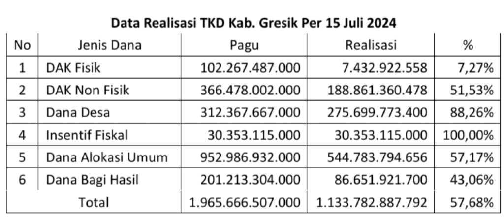 Sampai dengan tanggal 15 Juli 2024, KPPN Surabaya I telah manyalurkan TKD sebesar Rp1.133.782.887.792,- atau 57,68�ri total pagu Rp1.965.666.507.000,-.