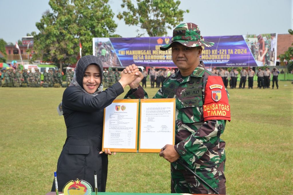 Bupati Mojokerto, Ikfina Fahmawati mengapresiasi peran aktif TNI dalam membantu pembangunan di wilayah Mojokerto.