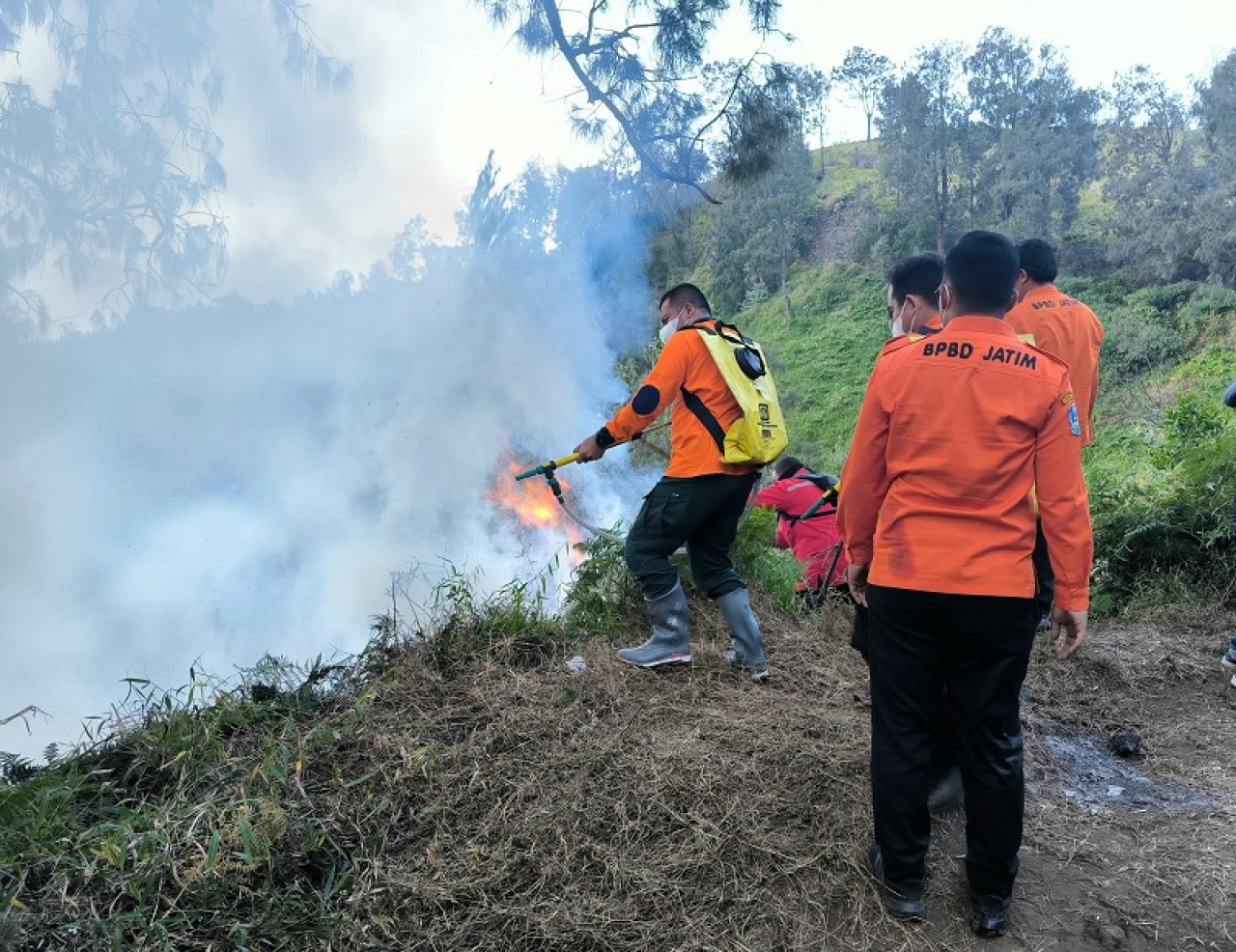 "Habis kegiatan, sebetulnya kita mau jalan-jalan. Tapi, kita lihat ada kebakaran di arah penanjakan dan belum ada tindakan. Akhirnya, kontak sana sini, termasuk ke TNBTS, pihak desa dan BPBD Pasuruan, " ujar Analis Kebencanaan Bidang Pencegahan BPBD Jatim, Dadang Iqwandy, mengisahkan.