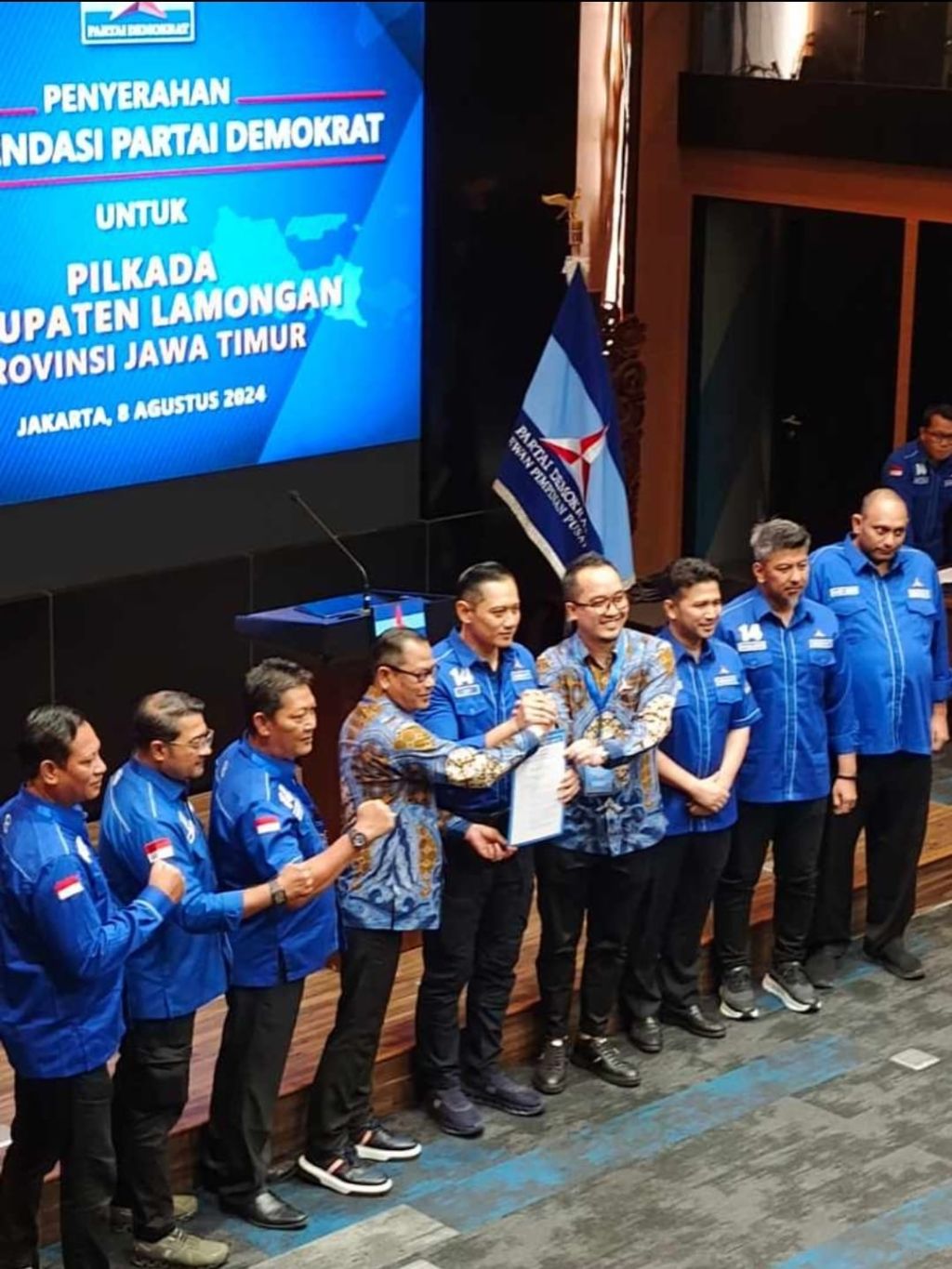Surat Keputusan bernomor 182/SK/PILKADA/DPP.PD/VIII/2024 tentang Persetujuan Pasangan Calon Bupati dan Wakil Bupati Kabupaten Lamongan Provinsi Jawa Timur, tertanggal 8 Agustus 2024, yang ditandatangani oleh Ketum Agus Harimurti Yudhoyono (AHY), dan Sekretaris Jenderal Teuku Riefky Harsya.