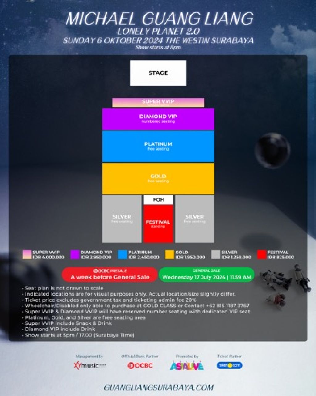 Tiket OCBC Presale tersedia mulai hari ini melalui OCBC Bank Staff Relations sementara penjualan untuk umum tersedia mulai hari Rabu, 17 Juli 2024 secara eksklusif di www.guangliangsurabaya.com pada pukul 11.59 WIB, dengan tiket.com sebagai the official ticketing partner.